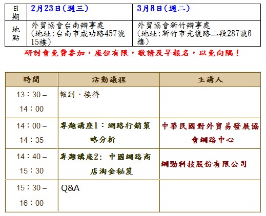 很多人喜歡網路購物,但或許您不一定知道,目前全球最大的購物網站是來自中國大陸的「淘寶網」。為協助我商迅速瞭解大陸網購市場、開發商機,外貿協會特與網勁科技合作辦理『網』路行銷,放眼中國市場巡迴研討會,為廠商說明如何於淘寶網、全買網等中國著名電子商城開設網路商店,成功進軍大陸網購市場。歡迎有意拓銷中國市場的廠商,點選『線上報名網址』選擇合適之場次,報名參加此研討會。